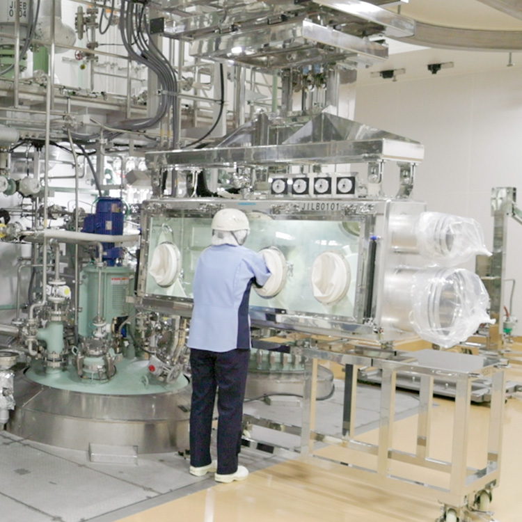 私はFJ2の建屋がほぼ完成した段階で、ここに配属となりました。入社2年目だったので不安もありましたが、新しいことにチャレンジできる喜びも大きかったですね。それまで小規模の商用生産を行う部署にいたので、規模もやりかたもがらっと変わりました。以前の部署では最終収量は100g程度でしたが、ここでは多いときは20kgにおよびます。原料の仕込みも以前はガロン瓶からメスシリンダーという実験室のような世界でしたが、今は、タンクからポンプで反応釡に移すという工場ならではの世界になりました。