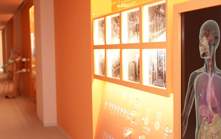 固形剤棟に隣接して見学者通路が設置され、日々企業や学校からの見学者を受け入れています。くすりができる過程や現場の服装等、製薬を身近に感じて頂ける施設となっています。