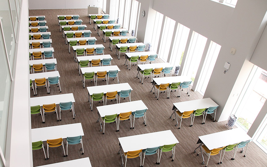 正面には巨大スクリーンが設置され工場見学会や大規模社内セミナー等の会場として使用しています。