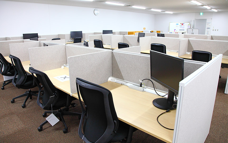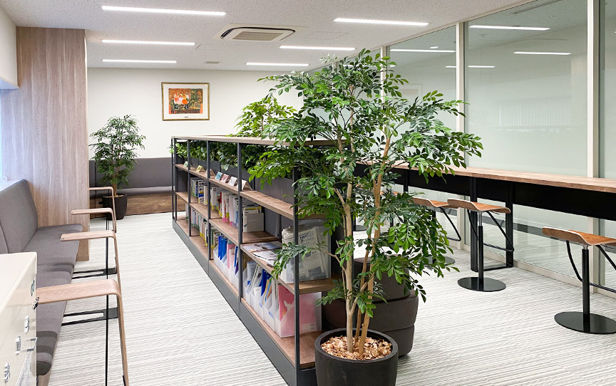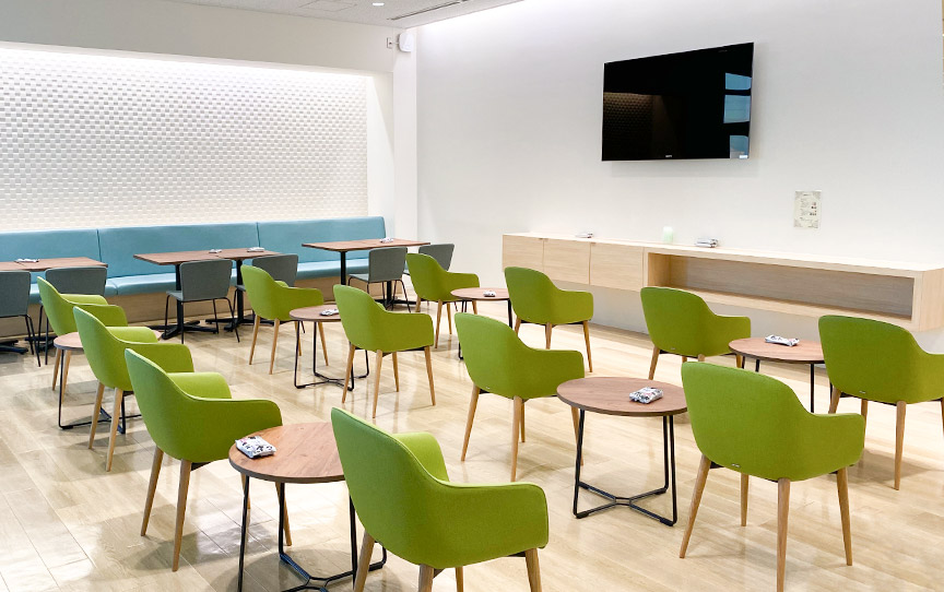 食堂の上階には、社員同士が気軽に会話したり作業できるフリースペースを設けています。オフィスとは異なるカジュアルな環境で、気分転換しながら業務に取り組めます。